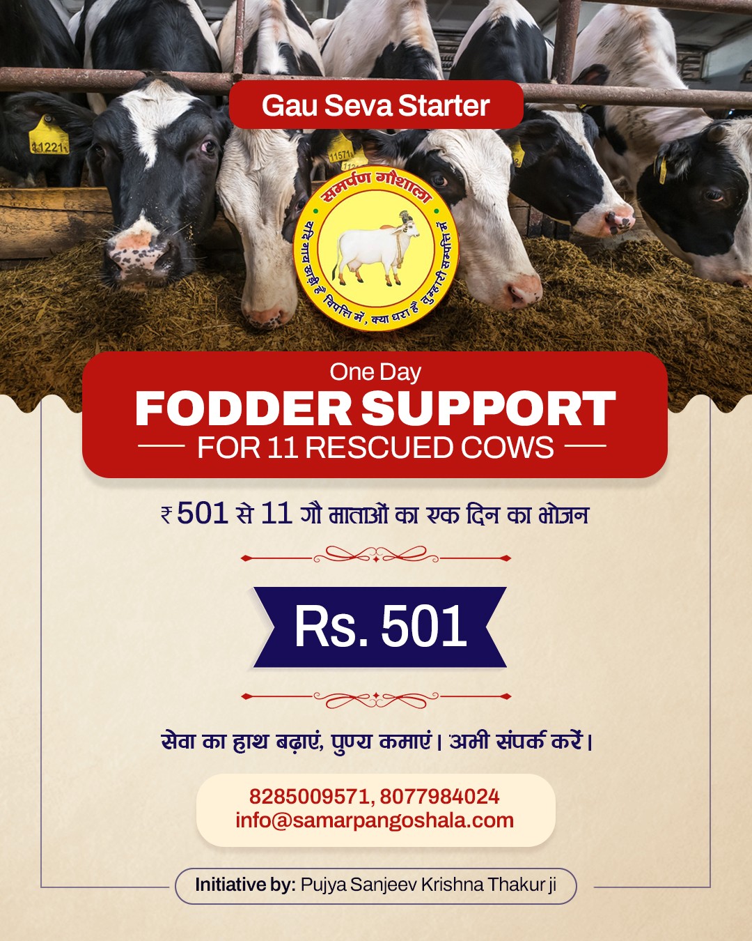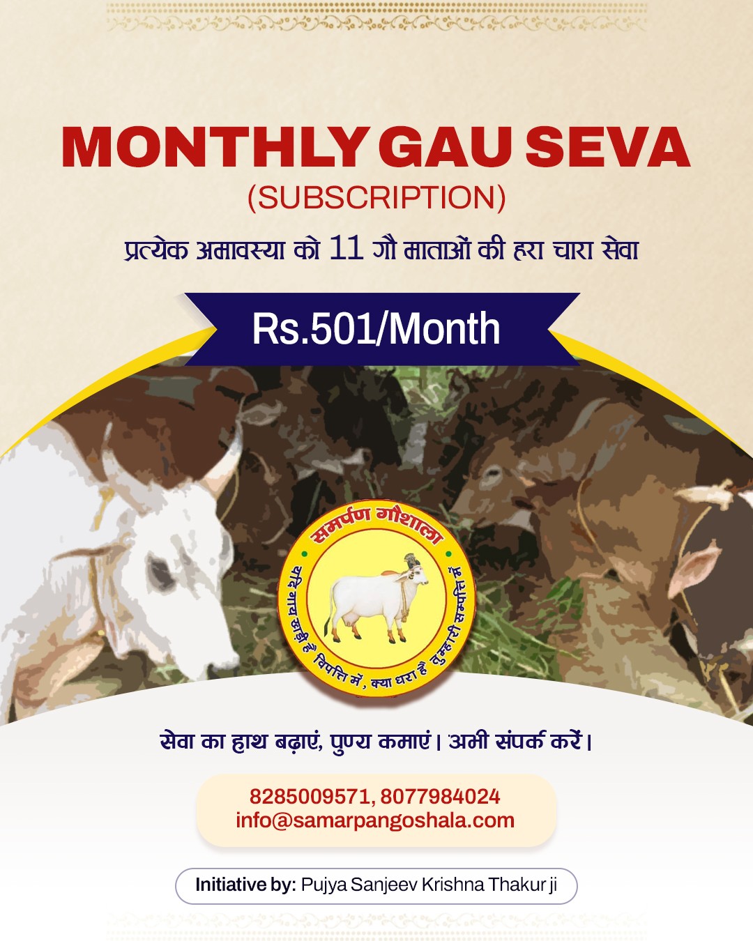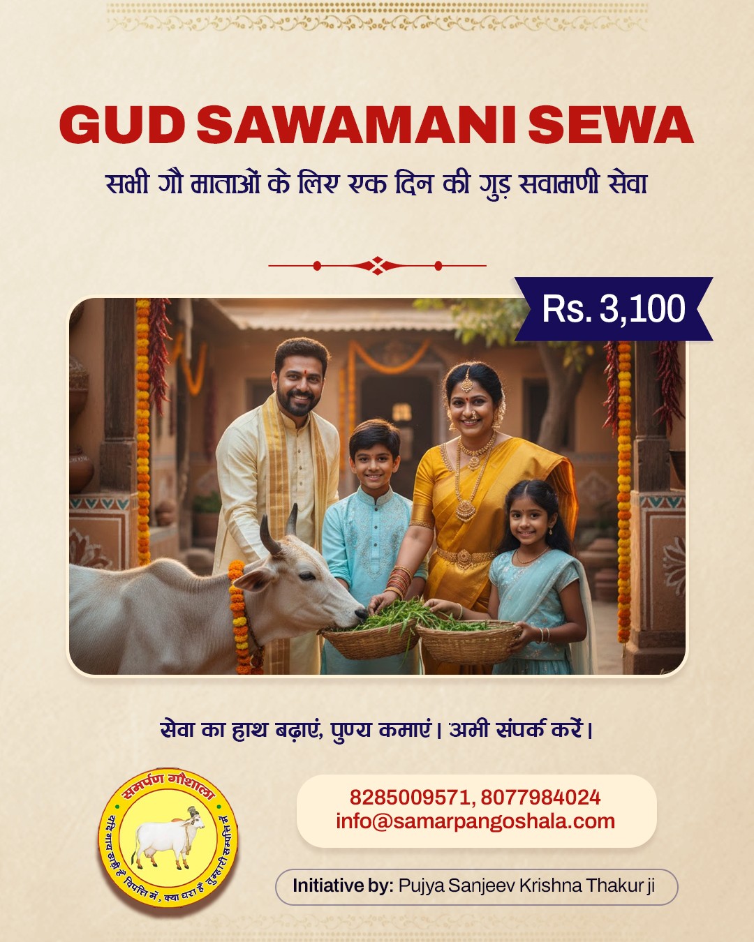 Samarpan Gaushala began in 2008 when H.H. Shri Sanjeev Krishna Thakur Ji, during Giriraj Ji parikrama, found Gau Matas searching for food in garbage. Moved by compassion, he established a 5-acre shelter in Govardhan through Shri Radha Madhav Sewasray Charitable Trust.