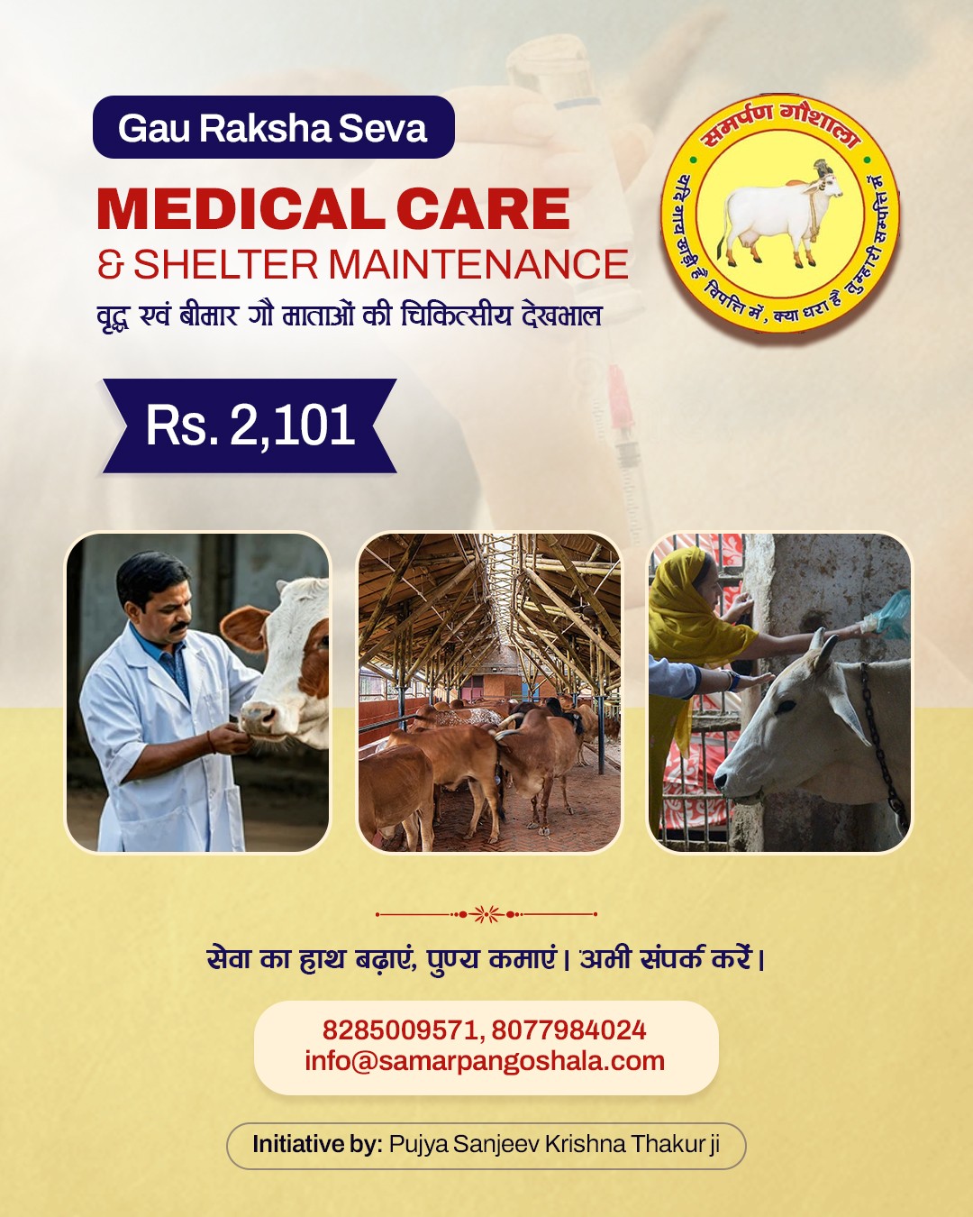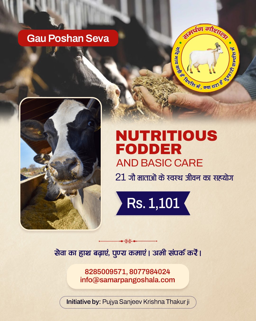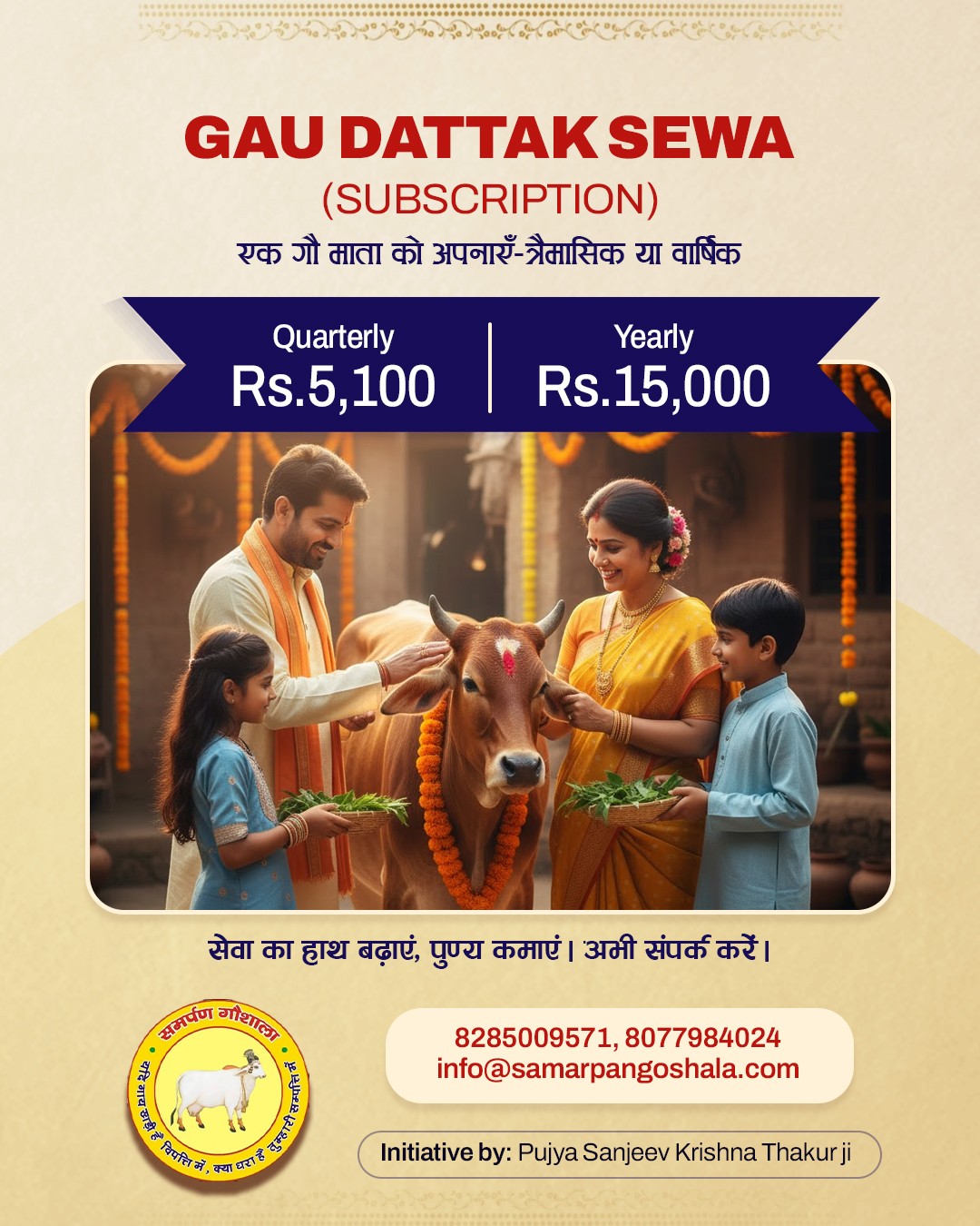Samarpan Gaushala began in 2008 when H.H. Shri Sanjeev Krishna Thakur Ji, during Giriraj Ji parikrama, found Gau Matas searching for food in garbage. Moved by compassion, he established a 5-acre shelter in Govardhan through Shri Radha Madhav Sewasray Charitable Trust.